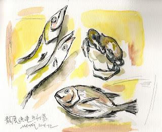 後龍龍鳳漁港 取得連結 Facebook X Pinterest 以電子郵件傳送 其他應用程式 11月 11, 2012 走二高在116K下交流道,接上西濱61馬上右轉就直達後龍龍鳳漁港。 約在這裡集合,等候時間東看西看,現下時興的拱橋一進停車場就可拾級而上,接上對面的防風林濱海步道,防風林上立上一根根高大的風力發電機,走在底下心驚驚。 漁港不外就是漁船與新鮮魚魚市,魚販說最快漁船回港也要11點過後。 漫無目的隨手畫了幾張,那條旗魚擺在角落,有人說好像一把破傘開花,走回停車場,一位阿婆大聲推銷又大又肥的芋頭,看起來一顆都要兩三斤,看了看,沒人買,阿婆在背後還是很賣力的推銷。 取得連結 Facebook X Pinterest 以電子郵件傳送 其他應用程式 留言